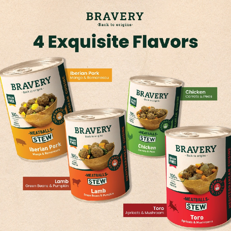 Taureau désossé 71%, tapioca, petits pois, gousse de caroube, huile d’olive extra vierge. Sauce : bouillon de cuisson, foie de bœuf, abricot 1,5%, champignons 1,5%, thym, romarin, extrait naturel de caroube.
